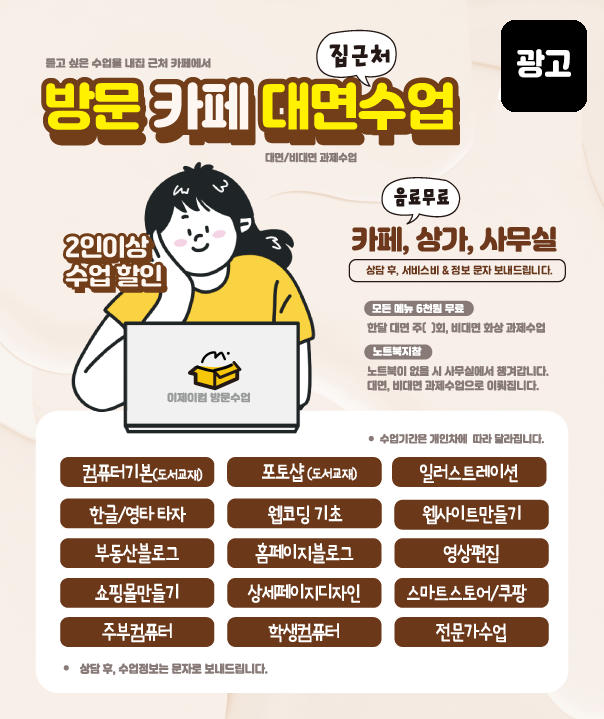 (* 노트북 없으면 대여가능하나, 노트북 보유하는 것을 추천드립니다. 결제 후 수업서비스는 수업 준비가 필요하여 이틀 뒤에 시작합니다. ) 대면 수업서비스 대면, 1회 1.5시간, 한달 / 주2회, 4주) 비대면, 대면 이외 날짜, 과제수업 제출 기본 개념 익히기 레이어 기본 개념, 포토샵 확장자명 등 수업서비스 일정 정하자 교재 훑어보기 포토샵 기본툴 익히기 과제 확인 및 피드백 포토샵으로 상세페이지디자인 만드는 방법 & 만들기 네이버상세페이지 or 쿠팡상세페이지 등 벤치마킹 디자인 따라 만들기 수업료 : 포토샵 + 상세페이지디자인 2과목 (협의)시간 및 횟수 : 협의장소 : 장..