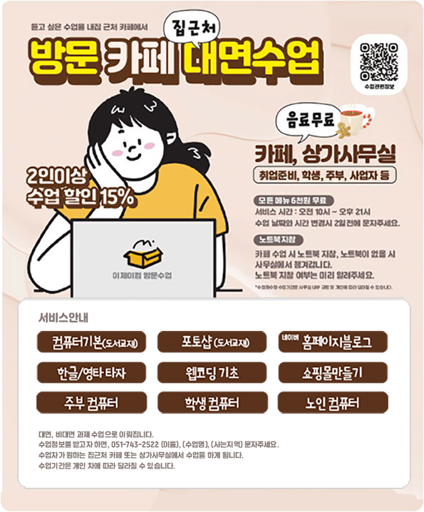 방문수업 가능 장소는 '인근카페, 아파트 커뮤니티, 상가 등' 오픈 된 공간에 수업이 가능합니다. * 노트북 수업으로 수업에 필요한 노트북 지참이 필요하나, 노트북이 없을 시, 노트북 대여 가능합니다. (수업비 포함)수업명 한글, 엑셀, 블로그홈페이지, 포토샵, 일러스트레이션, 쇼핑몰디자인, 초등웹코딩, 부동산블로그(공인중개사), 쇼핑몰만들기, 상세페이지디자인, 컴퓨터 초보 노인수업 등수업비수업비 : 문의 (상품별 할인상품있음)예약방법문자예약 : 010.2503.2521수업명 / 수업날짜 / 받고자 하는 수업 장소수업목적수업 및 제작 수업문의 또는 수업가능 전문직 종사자 모십니다. 051-743-2522, 051-743-2521 (문자가능)